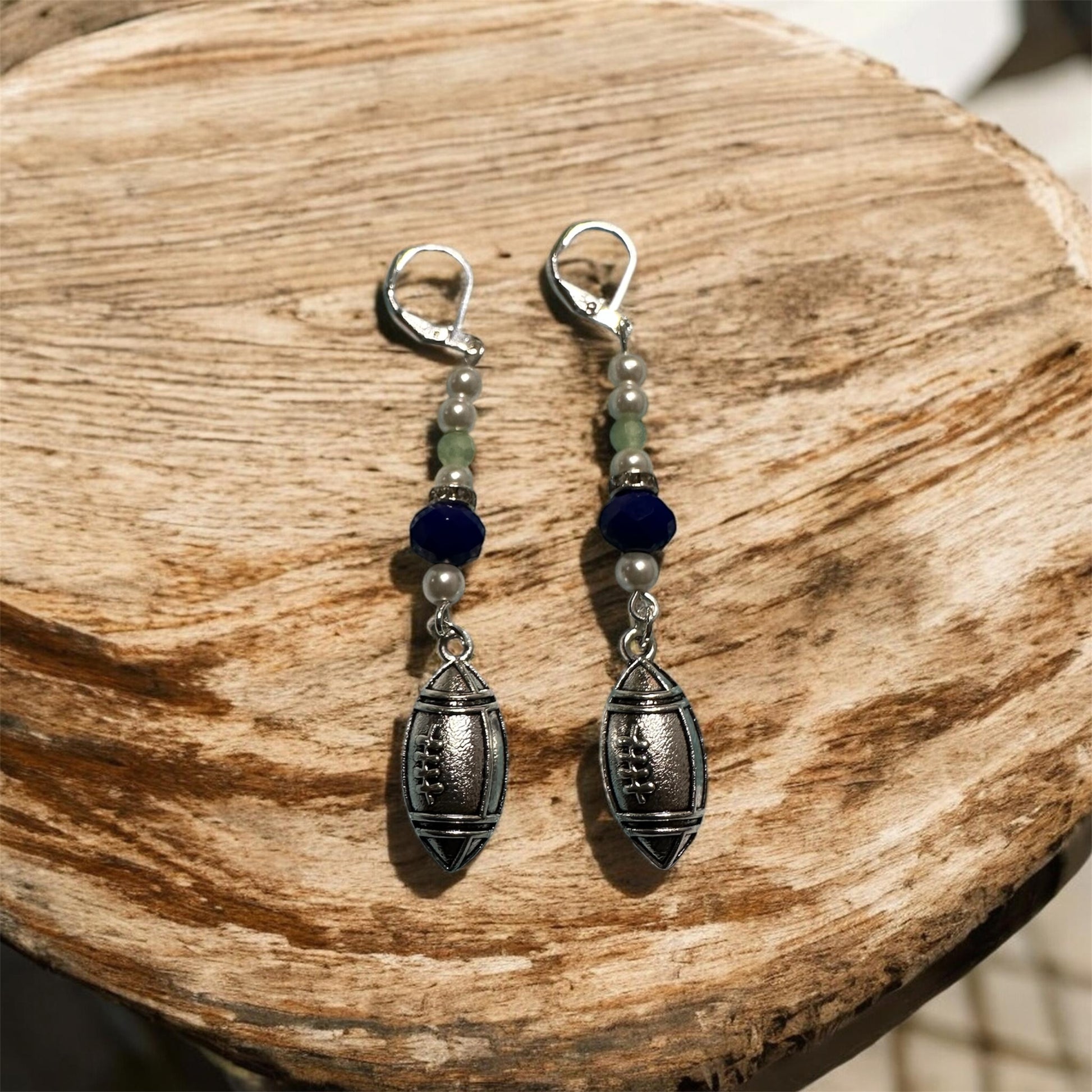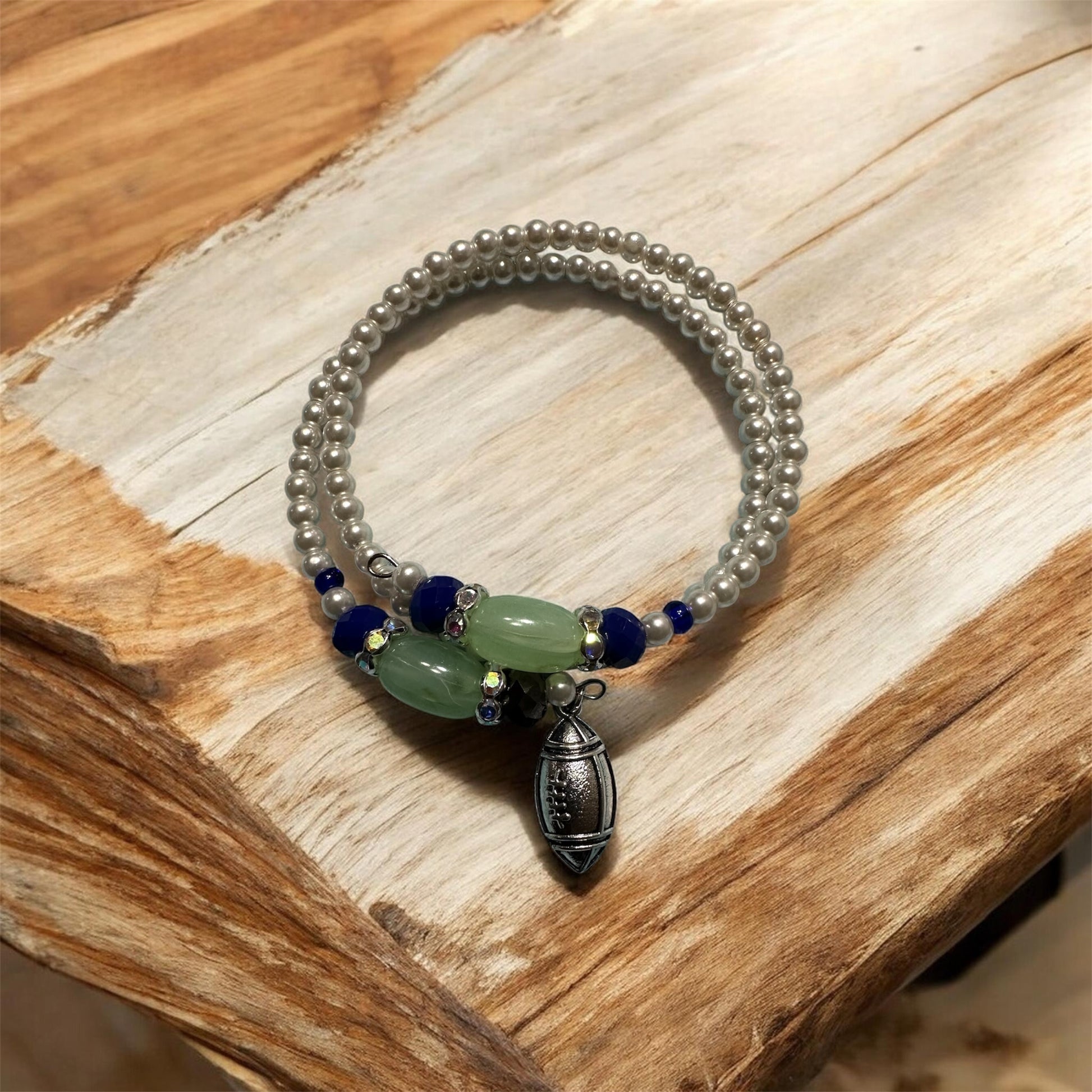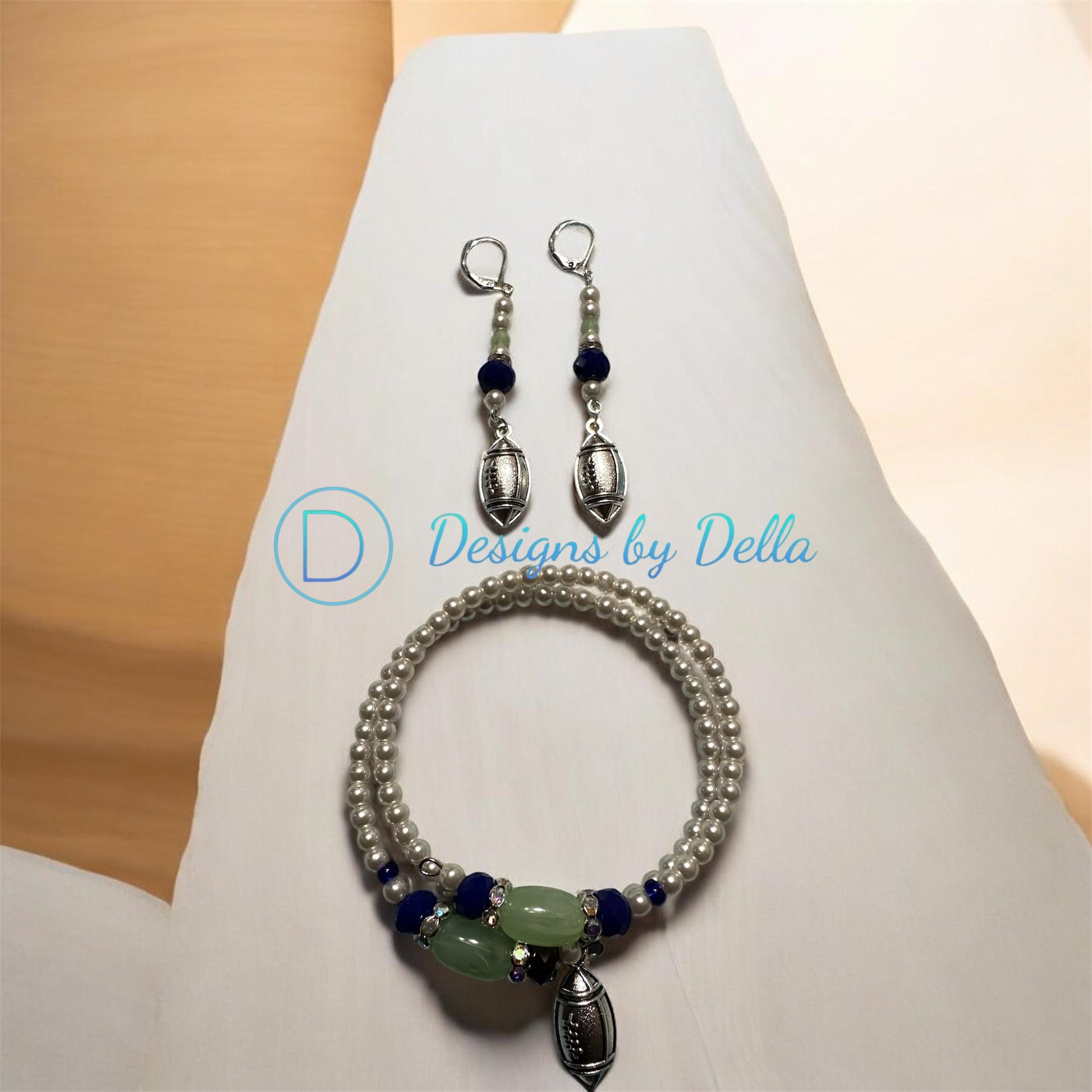 The 2PC Glass Pearl Bead Necklace Set features a handmade design in Seahawks fan-inspired colors. This set includes a glass pearl memory wire bracelet and matching sterling silver lever-back earrings. Crafted with attention to detail, it offers a unique accessory option that elevates your attire while reflecting team spirit.