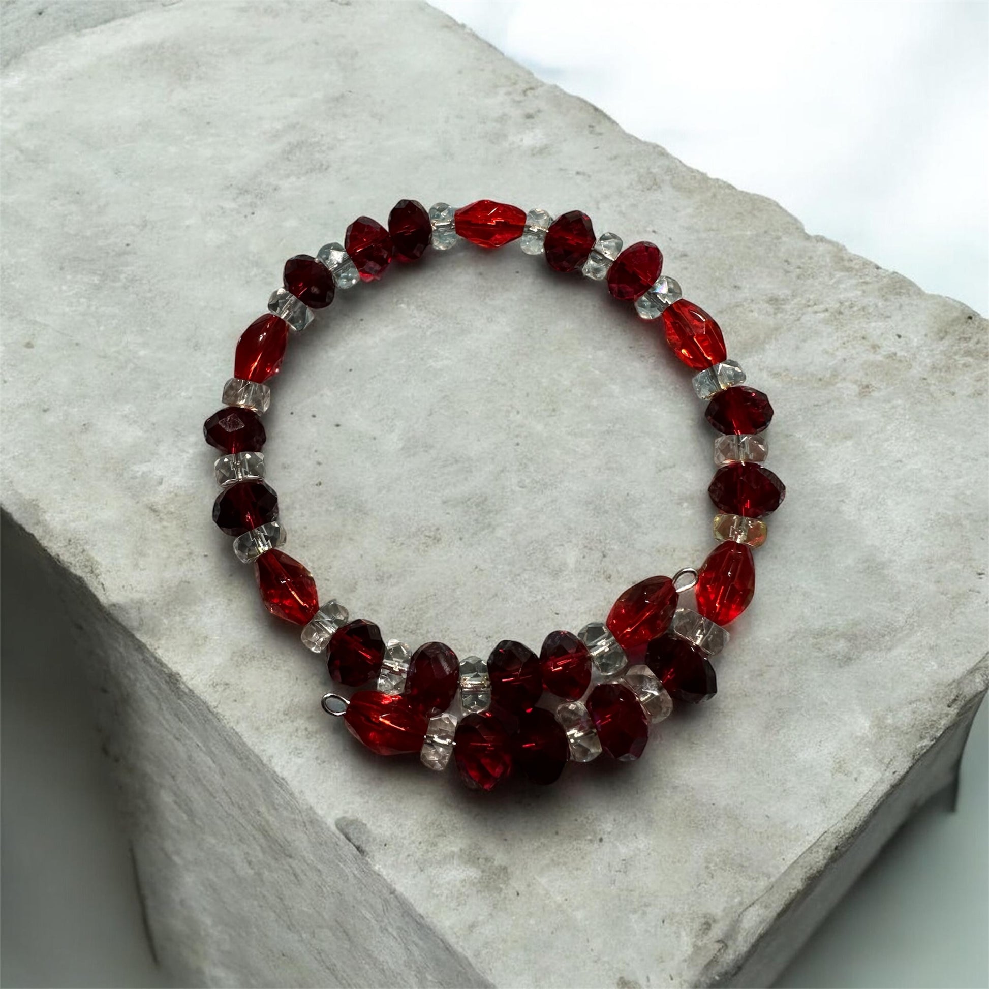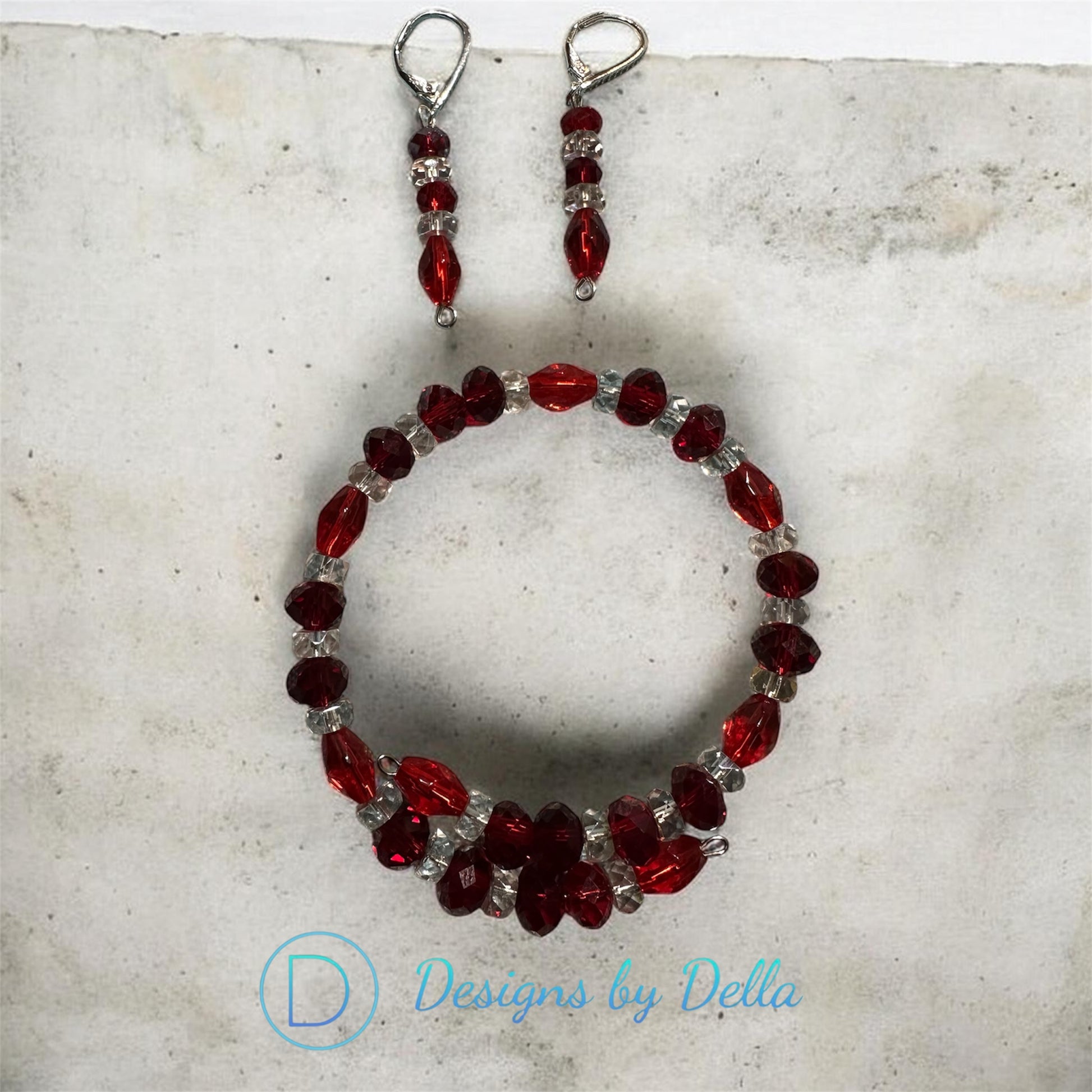 The 2PC set features a red and clear crystal bead memory wire bracelet alongside coordinating earrings. The earrings are equipped with sterling silver lever backs. Each piece is handcrafted, ensuring a unique design.